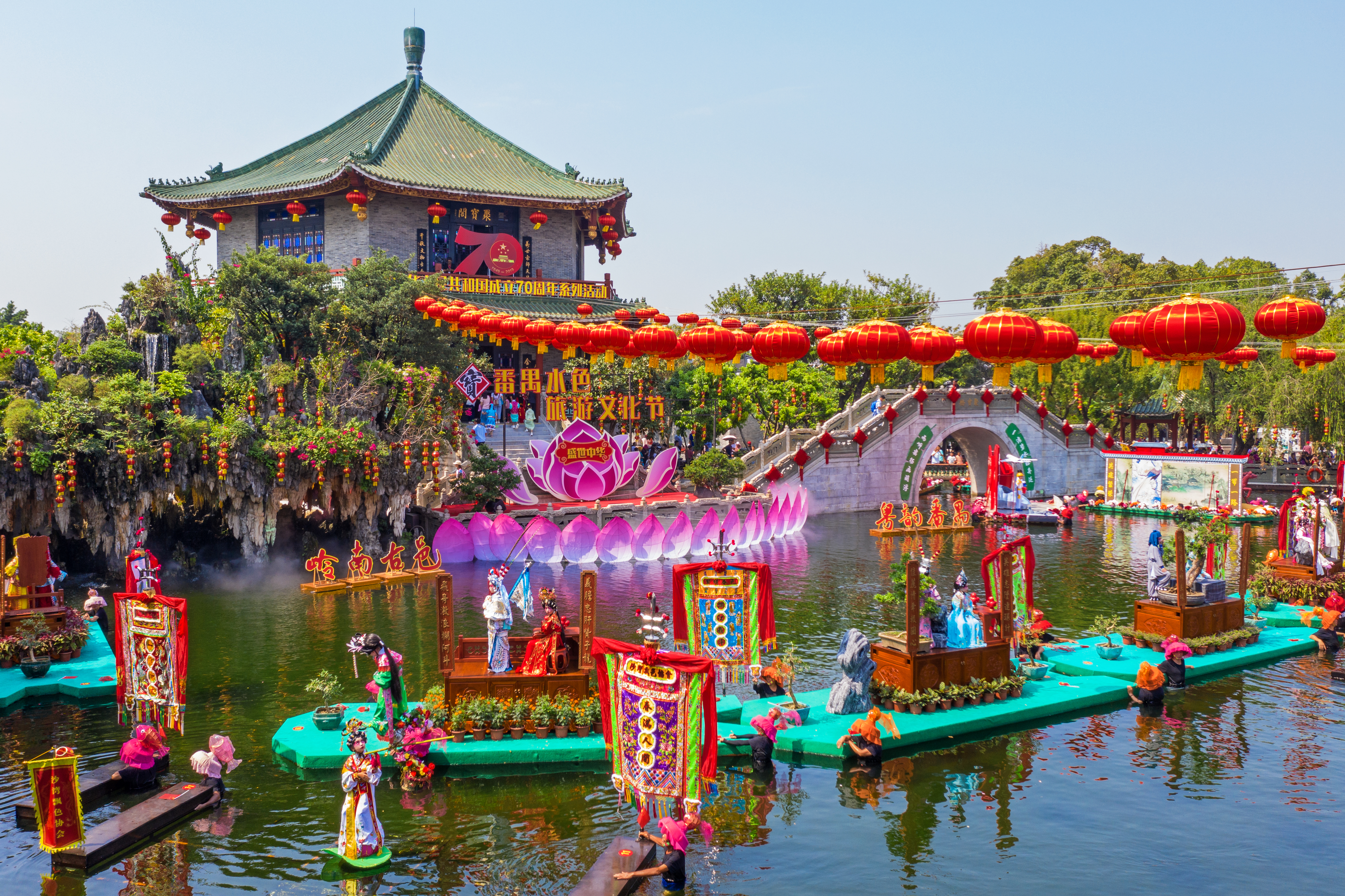 9月28日,我区庆祝中华人民共和国成立70周年系列活动——番禺水色旅游文化节在宝墨园开幕。此次紫坭春色、沙湾飘色、番禺水色三大番禺民间艺术奇葩在宝墨园荔景湖巡游大放光彩,三色生辉,共贺华诞。