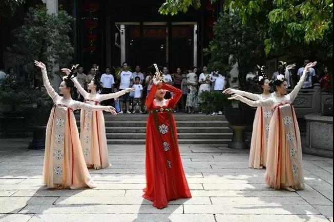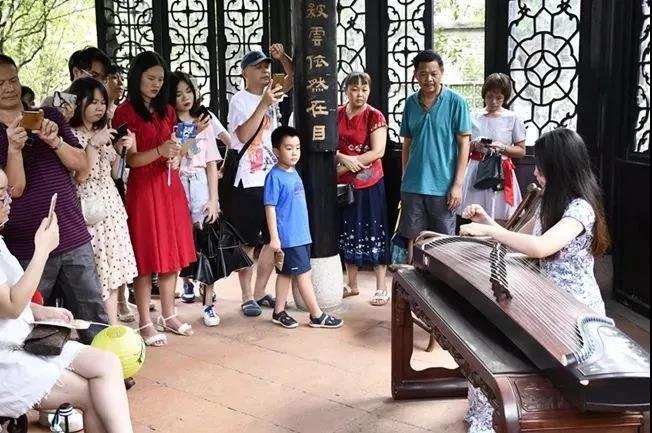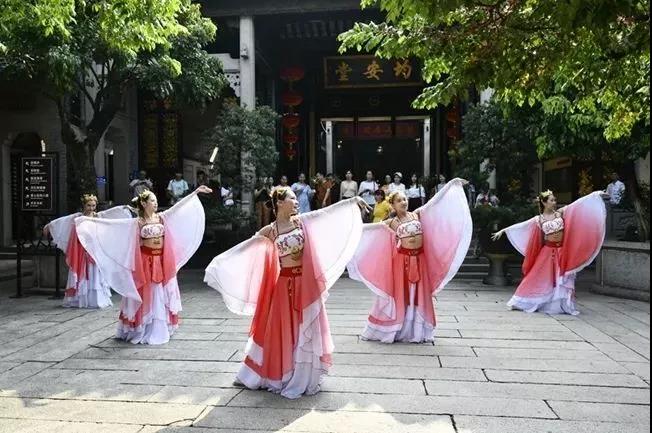 古风快闪区:古筝弹奏和古风舞蹈《丽人行》《琵琶行》节目,分别在玲珑水榭和善言邬公祠表演,让游客们在潺潺古筝声中,在柔美的舞蹈中,来次穿越之旅,领略古风之美。