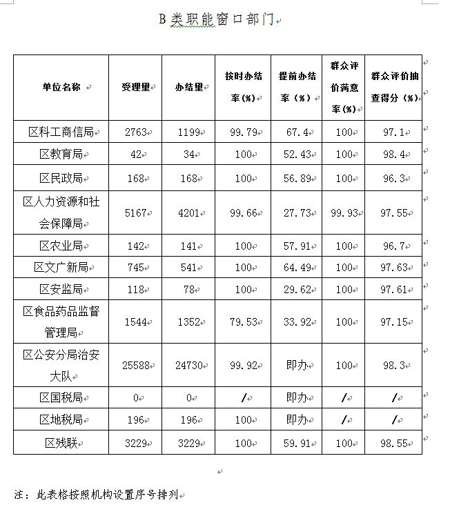 一、2017年度政务服务优秀窗口单位(9个):区国土资源和规划局、区卫生和计划生育局、区市场监督管理局、区住房和建设局、区食品药品监督管理局、区地税局、区国税局、区人力资源和社会保障局、区科技工业商务和信息化局(区知识产权局、区旅游局)。