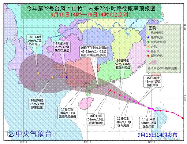 15日14时台风“山竹”(强台风级)中心在我区偏东南方约800公里南海东北部海面上。预计短期内将以28公里左右的时速向西偏北方向移动,趋向粤西沿海,并可能于16日下午到夜间以强台风至超强台风级(14-16级)在台山到徐闻之间沿海地区登陆。