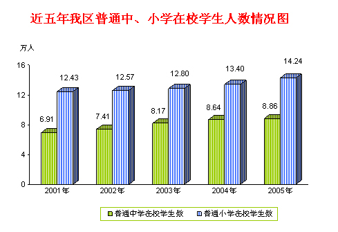 教育事业有新的发展,通过了省教育强区验收。全年投入教育经费12.89亿元。教育综合改造工程和教育信息化建设取得新进展,办学条件继续改善。2005年,全区共有幼儿园383所,在园幼儿5.31万人,下降0.2%。普通小学227所,在校学生14.27万人,增长6.3%。普通中学65所,在校学生8.86万人,增长2.5%;其中:高中2.65万人,增长8.5%,初中6.21万人,增长0.2%。年末教育强镇达8个,省市一级中小学校61所。