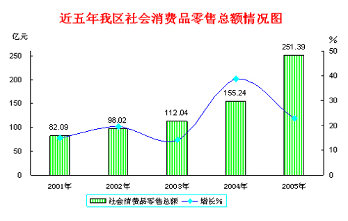 2005年,彩票平台推荐 实现社会消费品零售总额251.39亿元,增长22.9%。其中:批发零售行业200.21亿元,增长24.2%;餐饮业46.47亿元,增长26.7%。全年实现商品销售总额377.34亿元,增长24.7%。其中:批发行业销售总值172.42亿元,增长23.8%。