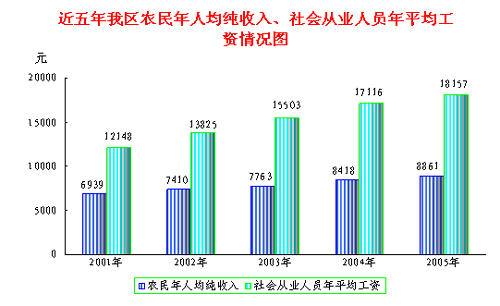 城乡居民收入继续提高。2005年全区社会从业人员年平均工资18157元(不含南沙,本段数据口径相同),增长4.1%;职工年平均工资23226元,增长4.5%。据我区120户城镇居民住户调查资料显示,城镇居民年人均可支配收入为18122 元,增长4.2%;人均住房建筑面积40.3平方米;年末城镇居民每百户家庭拥有彩电185台、空调器213台、家用电冰箱103台、家用洗衣机106台、家用电脑87台、移动电话227部、摩托车128辆、汽车15辆、组合音响55套。据我区90户农村住户调查资料显示,农村居民年人均纯收入为8861元,增长5.3%;农村居民人均住房建筑面积44.2平方米;年末农村居民每百户家庭拥有彩电148台、空调器130台、家用电冰箱 95台、家用洗衣机87台、家用电脑56台、摩托车144辆、淋浴热水器107台、固定电话机113部、移动电话210部。年末城乡居民储蓄余额533.57亿元,比年初增长13.8%。