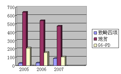 区计划生育服务站自2004年3月起开展了TORCH四项检查,近年相继增加了地中海贫血、G6-PD筛查等项目。三年多来,共检查孕妇19520人,初筛阳性者中,地中海贫血1634例,G6-PD470例,TORCH147例(如图表2所列的三年阳性例数图),其中17