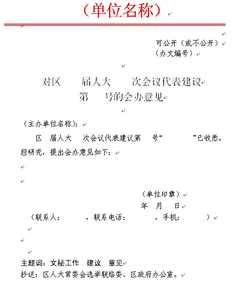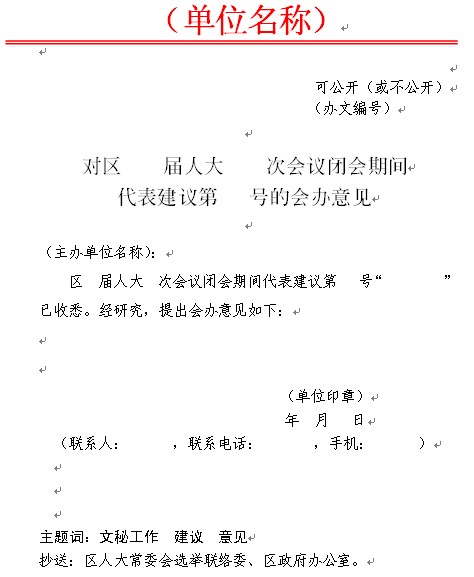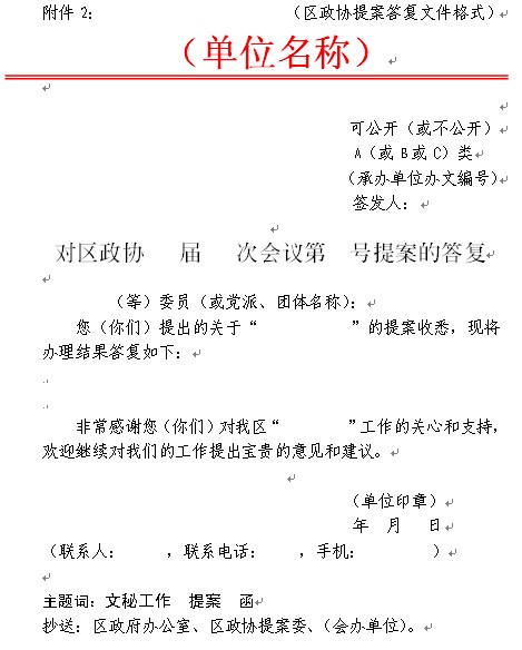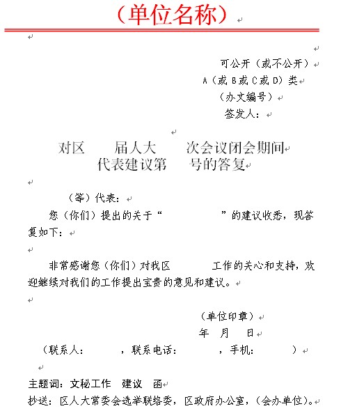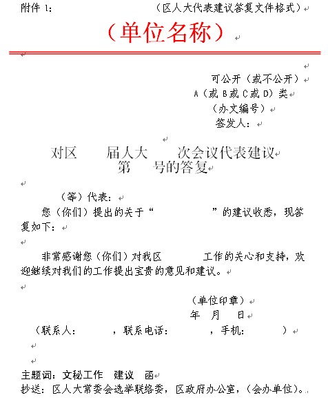(四)对区人大代表建议和政协提案办理答复,由主办单位将每份答复件按规定格式先送1份给区政府办公室呈区政府分管领导审核同意后,主办单位再将正式答复件按份数要求送区政府办公室统一转交区人大和区政协。同时,主办单位将正式答复件(不盖章)的电子文档报送区政府办公室。