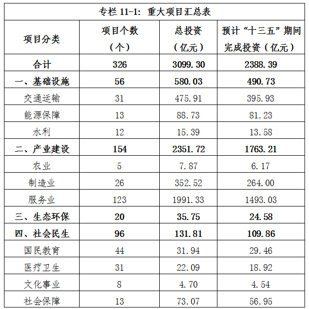 加快推进重大项目建设。完善项目推进联席会议制度,落实专人责任机制。重视重大项目前期工作,加快项目审批。发挥民间资本作用,统筹资源,完善配套设施,推进重大项目建设。“十三五”期间全区安排重大项目326个,总投资3099.30亿元,预计完成投资2388.39亿元。项目单位预计项目建成后,2020年比2015年新增产值(或收入)2956.79亿元,其中,服务业、制造业、农业项目分别为1979.42亿元、941.8亿元和35.57亿元(园区项目产值均统计到服务业中,但包括部分制造业产值)。