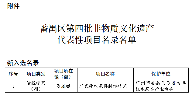 根据《中华人民共和国非物质文化遗产法》《国务院办公厅关于加强我国非物质文化遗产保护工作的意见》和《广东省非物质文化遗产条例》等有关规定,经区级专家评审和区非物质文化遗产保护中心评定并向社会公示,同意将“广式硬木家具制作技艺”项目列入我区第四批非物质文化遗产代表性项目名录,现予以公布。