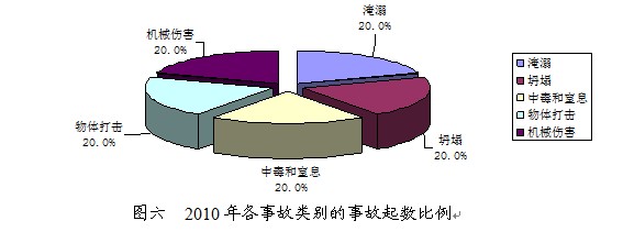 2010年,生产安全事故的事故类别主要是淹溺、坍塌、中毒和窒息、物体打击、机械伤害等5类,各发生事故1起;淹溺事故造成2人死亡,其他类别事故分别造成1人死亡。(2010年各事故类别起数和死亡人数比例见图六和图七)