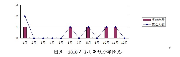 2、3、4、5、7、9、12月份没有发生生产安全事故, 1、6、8、10、11月份各发生生产安全事故1起。(2010年各月事故分布情况见图五)