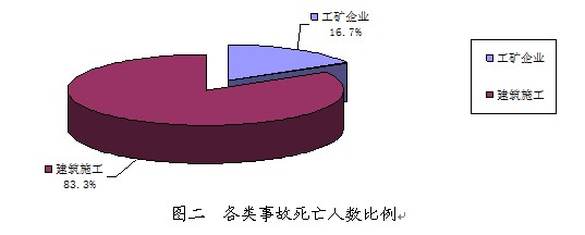 工矿企业(含建筑)共发生生产安全事故5起、死亡6人,其中,建筑施工领域事故4起、死亡5人,分别占事故总起数和死亡总人数的80%和83.3%。(2010年各类事故起数、死亡人数情况分别见图一和图二)