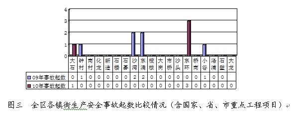 2010年,东环街和大石街分别发生生产安全事故3起和1起,分别造成死亡人数3人和1人;榄核镇和东涌镇交界处发生生产安全事故1起,死亡2人。