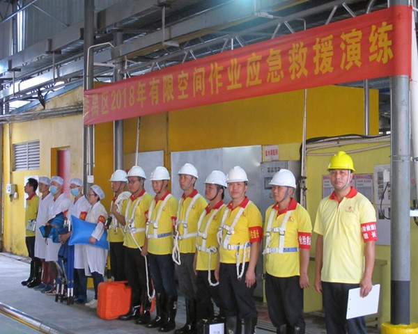 首先,与会人员现场观摩学习了市广味源食品有限公司的有限空间作业管理制度、安全管理看板以及操作现场展示日常有限空间作业程序,并观看现场应急救援措施处置演练。