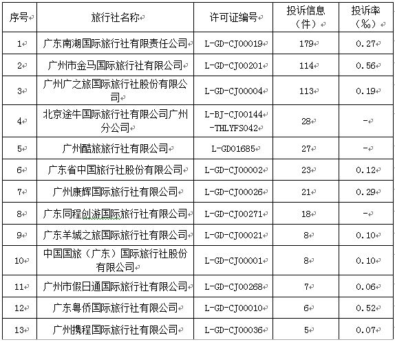 截止2016年9月30日,广州市共有旅行社503家,第三季度广州市组团人数共计293.36万人次。投诉热点主要集中在拒签退团扣费纠纷、旅行社因故延误变更行程、导游未尽职责、降低等级标准等方面。现按照《旅游法》、《旅行社条例》、《旅行社公告暂行规定》、广州市旅游局《旅游投诉信息公示内容及标准(试行)》的要求,将旅游者对以下13家旅行社投诉信息公示如下: