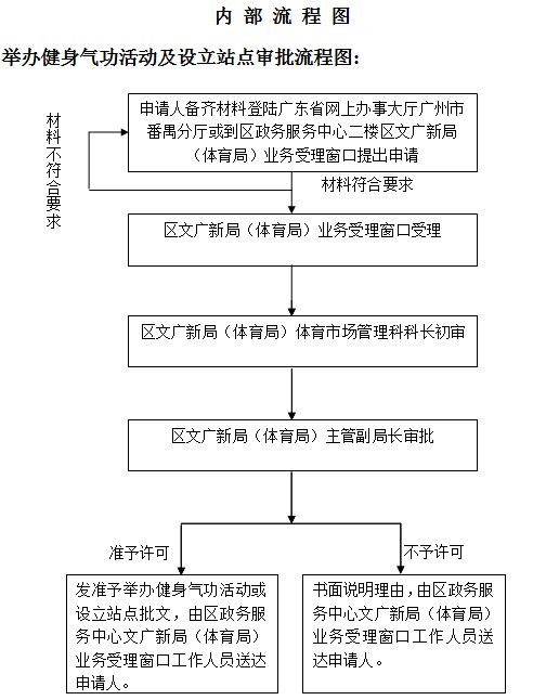 一、 《国务院对确需保留的行政审批项目设定行政许可的决定》(颁发主体:国务院;颁发文号:令412/2004;颁发日期:20040629;施行日期:20040701336)第336项; 二、《健身气功管理办法》(颁发主体:体育总局;颁发文号:体育总局令9/2006;颁发日期:20061117;施行日期:20061220): 第五条:举办健身气功活动或设立健身气功站点,应当获得体育行政部门的批准。体育行政部门收到举办健身气功活动或设立健身气功站点的申请后,应当于二十个工作日内做出批准或不批准的决定,并书面通知申请人。二十个工作日内不能做出决定的,经体育行政部门负责人批准,可以延长十个工作日,并将延长期限的理由告知申请人; 第十一条:参加人数在二百人以上的健身气功活动,除报体育行政部门审核批准外,还应当按照《群众性文化体育活动治安管理办法》的规定经公安机关许可; 第十七条:设立健身气功站点,应当经当地街道办事处、乡镇级人民政府或企事业单位有关部门审核同意,报当地具有相应管辖权限的体育行政部门审批; |