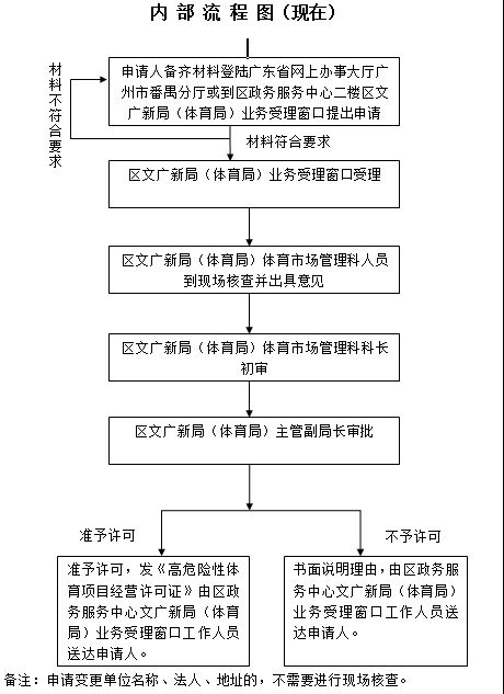 《广东省高危险性体育项目经营活动管理规定》第九条:经营者要求变更行政许可事项内容的,应当向所在地地级以上市体育行政部门提出申请。符合法定条件、标准的,体育行政部门应当自收到申请之日起十五日内依法办理变更手续。 |