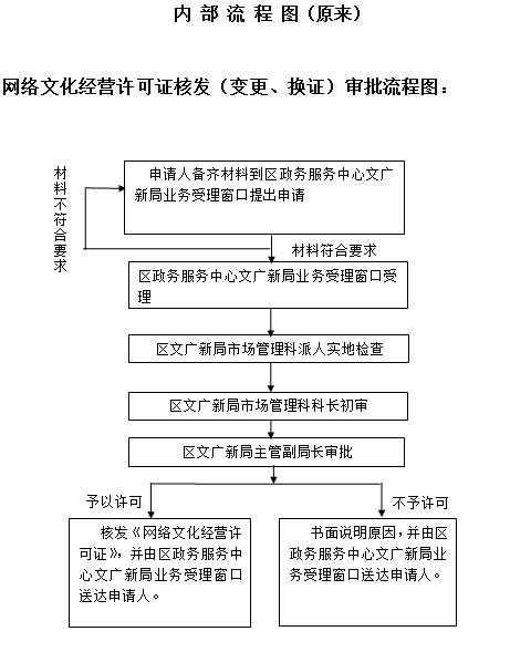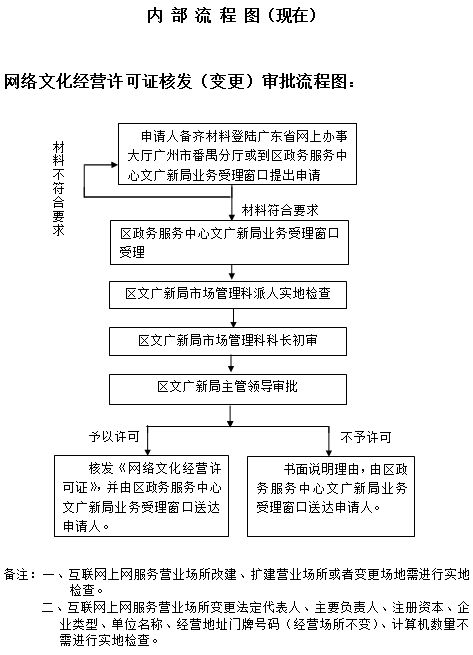 1、《广东省文化厅 广东省工商行政管理局 广东省公安厅 广东省通信管理局转发文化部 工商总局 公安部 工业和信息化部关于加强执法监督 完善管理政策 促进互联网上网服务行业健康有序发展的通知》(粤文市〔2015〕87号)附件:文化行政部门互联网上网服务营业场所审批指引 文本一:文化行政部门互联网上网服务营业场所行政审批规范 五、变更程序(一) |