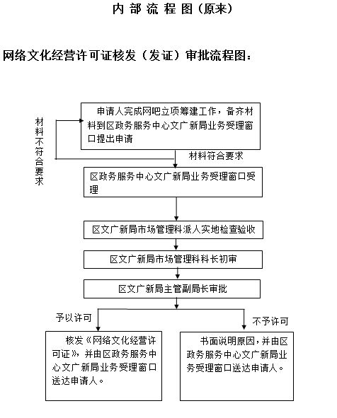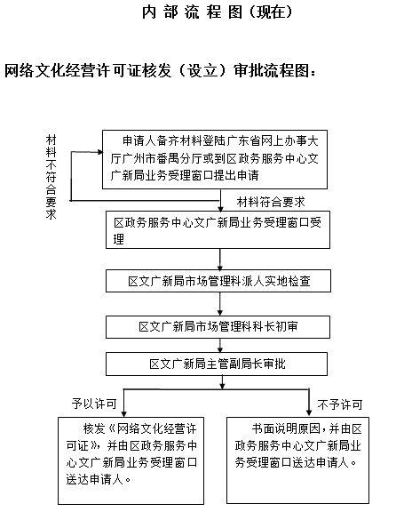 1.《互联网上网服务营业场所管理条例》(国务院令第363号)第十条; 2.《广东省文化厅 广东省工商行政管理局 广东省公安厅 广东省通信管理局转发文化部 工商总局 公安部 工业和信息化部关于加强执法监督 完善管理政策 促进互联网上网服务行业健康有序发展的通知》(粤文市〔2015〕87号)附件:文化行政部门互联网上网服务营业场所审批指引 文本一:文化行政部门互联网上网服务营业场所行政审批规范 四、审批程序(一)受理 |