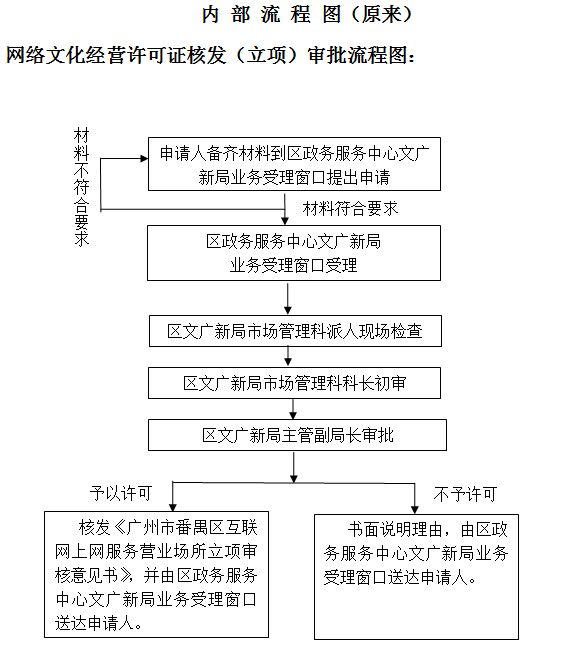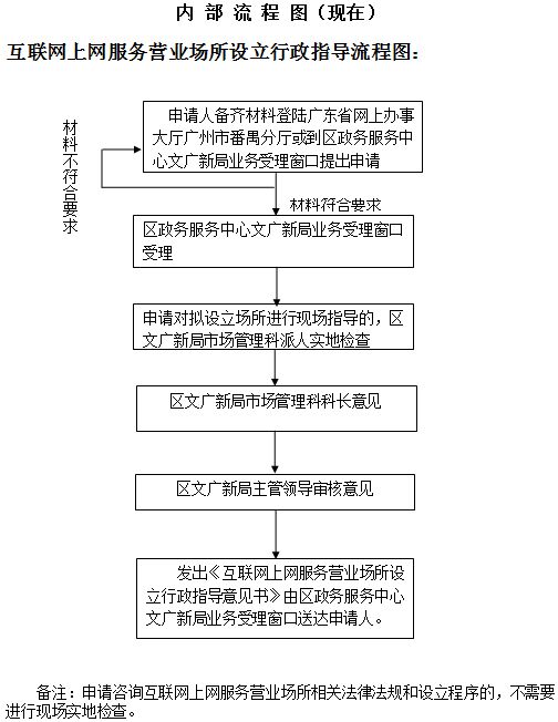 《广东省文化厅 广东省工商行政管理局 广东省公安厅 广东省通信管理局转发文化部 工商总局 公安部 工业和信息化部关于加强执法监督 完善管理政策 促进互联网上网服务行业健康有序发展的通知》(粤文市〔2015〕87号)。附件:文化行政部门互联网上网服务营业场所审批指引。一、互联网上网服务营业场所行政审批规范。文本一:文化行政部门互联网上网服务营业场所行政审批规范。三、行政指导程序(非必要程序)(一)(二)(三)。