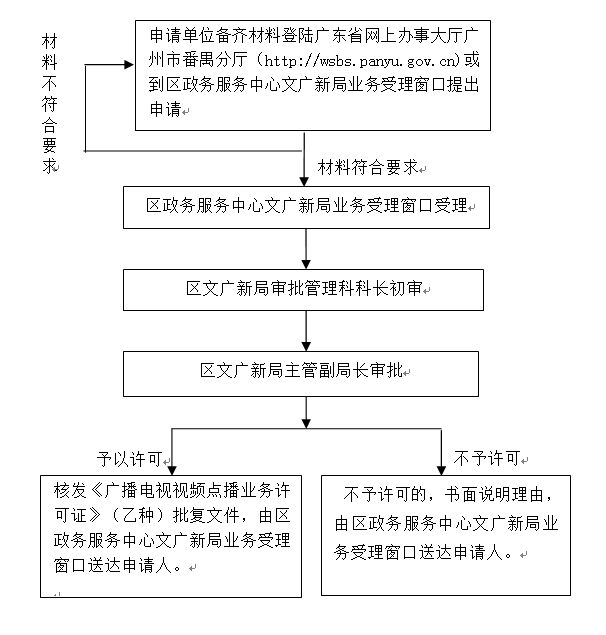 一、《广播电视视频点播业务管理办法》(国家广播电影电视总局令第35号)第四条 国家对视频点播业务实行许可制度。未经许可,任何机构和个人均不得开办视频点播业务。第五条 开办视频点播业务须取得《广播电视视频点播业务许可证》。第六条 《广播电视视频点播业务许可证》分为甲、乙两种。持有《广播电视视频点播业务许可证(甲种)》的机构,可在许可证载明的行政区域内从事视频点播业务。持有《广播电视视频点播业务许可证(乙种)》的机构,可在许可证载明的宾馆饭店内从事视频点播业务。第八条 下列机构可以申请《广播电视视频点播业务许可证(乙种)》:(一)三星级以上或相当于三星级以上的宾馆饭店;(二)具有同时为10家以上三星级或相当于三星级以上的宾馆饭店提供视频点播业务能力的机构。第十二条 申请《广播电视视频点播业务许可证(乙种)》,应向当地县级以上广播电视行政部门提出申请,并提交符合第十条规定的申报材料。经逐级审核后,报省级广播电视行政部门审批。省级广播电视行政部门对申报材料进行审核,审核合格的,申办机构可以安装视频点播设备。设备安装完毕,省级广播电视行政部门组织验收,根据验收结论做出决定,符合条件的,颁发《广播电视视频点播业务许可证(乙种)》,并在九十日内报广电总局备案;不符合条件的,书面通知申办机构并说明理由。第十四条 《广播电视视频点播业务许可证》有效期为三年,自颁发之日起计算。有效期届满,需继续经营视频点播业务的,应于期满前六个月按本办法规定的审批程序办理续办手续。 二、《广东省人民政府2012年行政审批制度改革事项目录(第一批)》(广东省人民政府令第169号)三、省政府决定下放实施的行政审批事项第64项:广播电视视频点播业务许可证(乙种)审批。