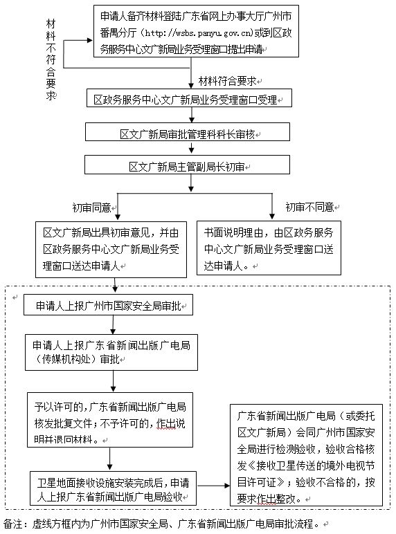 1.《卫星电视广播地面接收设施管理规定》(1993年10月05日国务院令第129号发布 根据2013年07月18日《国务院关于废止和修改部分行政法规的决定》修订)第七条 单位设置卫星地面接收设施的,必须向当地县、市人民政府广播电视行政部门提出申请,报省、自治区、直辖市人民政府广播电视行政部门审批,凭审批机关开具的证明购买卫星地面接收设施。卫星地面接收设施安装完毕,由审批机关发给《接收卫星传送的电视节目许可证》。第八条 个人不得安装和使用卫星地面接收设施。如有特殊情况,个人确实需要安装和使用卫星地面接收设施并符合国务院广播电影电视行政部门规定的许可条件的,必须向所在单位提出申请,经当地县、市人民政府广播电视行政部门同意后报省、自治区、直辖市人民政府广播电视行政部门审批。 2.《广东省第二批扩大县级政府管理权限事项目录》(省政府令第161号)三、下放管理的日常管理业务事项 23项《接收卫星传送的境外电视节目许可证》初审 |