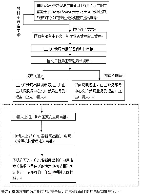 1.《卫星电视广播地面接收设施管理规定》(1993年10月05日国务院令第129号发布 根据2013年07月18日《国务院关于废止和修改部分行政法规的决定》修订)第七条 单位设置卫星地面接收设施的,必须向当地县、市人民政府广播电视行政部门提出申请,报省、自治区、直辖市人民政府广播电视行政部门审批,凭审批机关开具的证明购买卫星地面接收设施。卫星地面接收设施安装完毕,由审批机关发给《接收卫星传送的电视节目许可证》。第八条 个人不得安装和使用卫星地面接收设施。如有特殊情况,个人确实需要安装和使用卫星地面接收设施并符合国务院广播电影电视行政部门规定的许可条件的,必须向所在单位提出申请,经当地县、市人民政府广播电视行政部门同意后报省、自治区、直辖市人民政府广播电视行政部门审批。 《<卫星电视广播地面接收设施管理规定>实施细则》(广播电影电视部令第11号)第十三条 《许可证》不得涂改或转让。需要收变《许可证》规定的内容或者不再接收卫星传送的电视节目单位,应按设置卫星地面接收设施接收电视节目的申请程序,及时报请审批机关换发或者注销《许可证》。 2.《广东省第二批扩大县级政府管理权限事项目录》(省政府令第161号)三、下放管理的日常管理业务事项 23项《接收卫星传送的境外电视节目许可证》初审 |