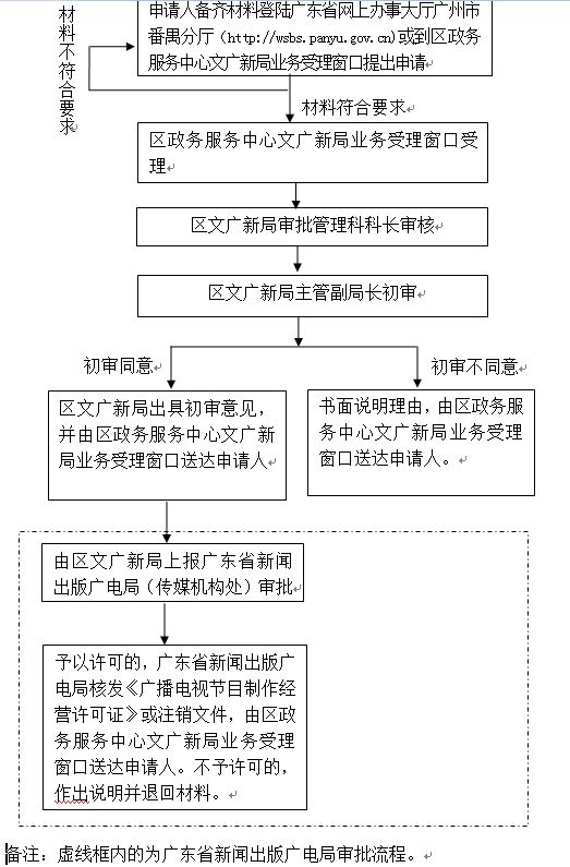 一、《广播电视节目制作经营管理规定》(2004年7月19日国家广播电影电视总局令第34号公布 根据2015年8月28日国家新闻出版广电总局令第3号《关于修订部分规章和规范性文件的决定》修正)第八条: 在京的中央单位及其直属机构申请《广播电视节目制作经营许可证》,报广电总局审批;其他机构申请《广播电视节目制作经营许可证》,向所在地广播电视行政部门提出申请,经逐级审核后,报省级广播电视行政部门审批。 审批机关应在收到齐备的申请材料之日起的二十个工作日内做出批准或不批准的决定。对符合本规定第六条、第七条规定的,应为申请机构核发《广播电视节目制作经营许可证》;对不批准的,应向申请机构书面说明不予批准的理由。 省级广播电视行政部门应在做出批准或不批准决定之日起的一周内,将审批情况报广电总局备案。 《广播电视节目制作经营许可证》由广电总局统一印制。有效期为两年。 第二十七条 《广播电视节目制作经营许可证》和《电视剧制作许可证(甲种)》载明的制作机构名称、法定代表人、地址和章程、《电视剧制作许可证(乙种)》载明的制作机构名称、剧名、集数等发生变更,持证机构应报原发证机关履行变更审批手续;终止广播电视节目制作经营活动的,应在一周内到原发证机关办理注销手续。 二、《广东省第二批扩大县级政府管理权限事项目录》(广东省人民政府令第161号)三、下放管理的日常管理业务事项第27项:《广播电视节目制作经营许可证》初审 |